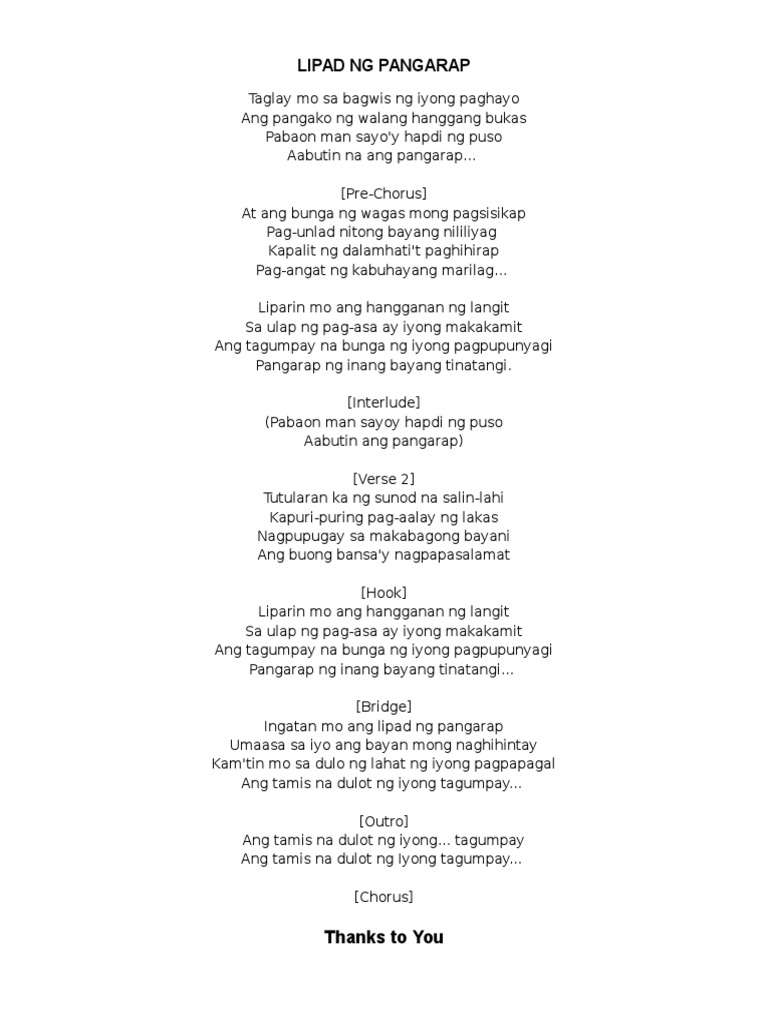 Lyrics to the song Lipad Ng Pangarap - Dessa - Song lyrics of all. At ang bunga ng wagas mong pagsisikap. Taglay mo sa bagwis ng iyong.
